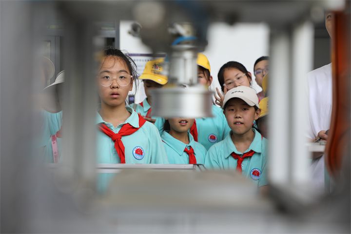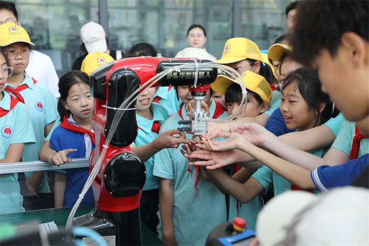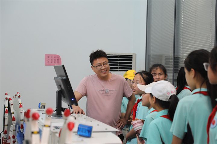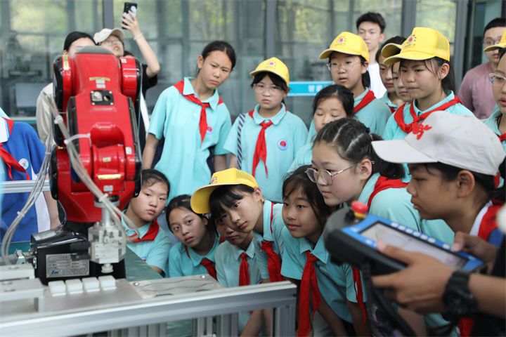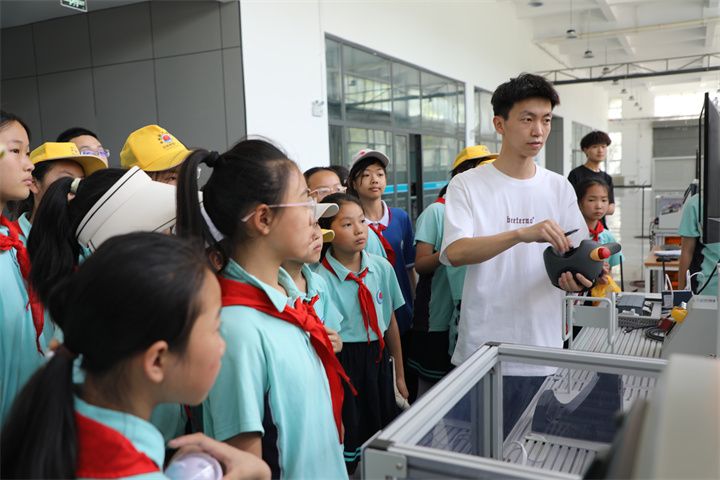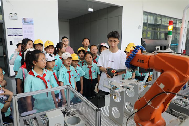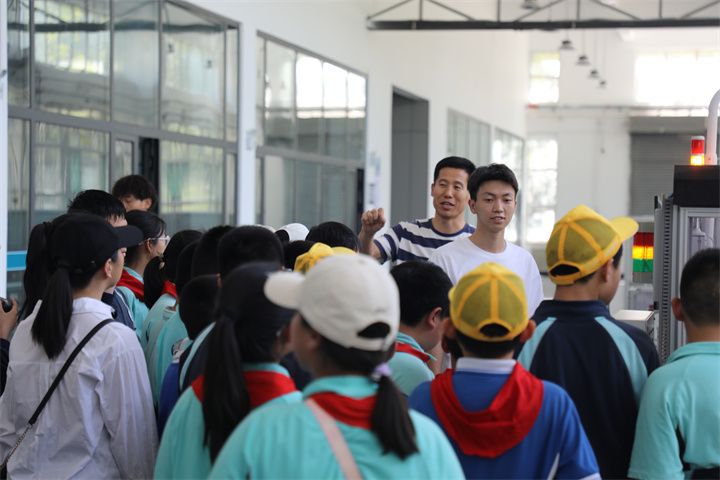 在智能制造实训中心,讲解老师熟练地展示了工业机器人完整的运作过程,模拟汽车轮胎加工的设备和码垛的工作流程,激发同学们的学习热情和兴趣。