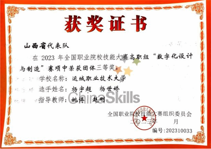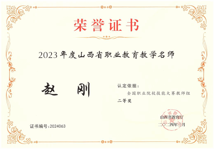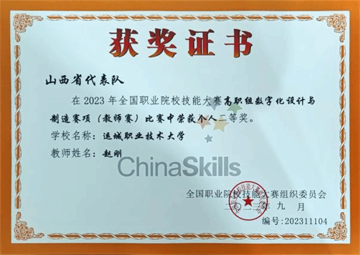 2023年,赵刚老师指导学生参加技能大赛取得丰硕成果:全国职业院校技能大赛(高职组)数字化设计与制造赛项三等奖1项;全国职业院校技能大赛(教师组)数字化设计与制造赛项二等奖1项;山西省第十七届职业院校技能大赛“数字化设计与制造”赛项一等奖1项、二等奖2项、三等奖1项;第四届山西省职业技能大赛“增材制造”赛项一等奖1项、二等奖2项。