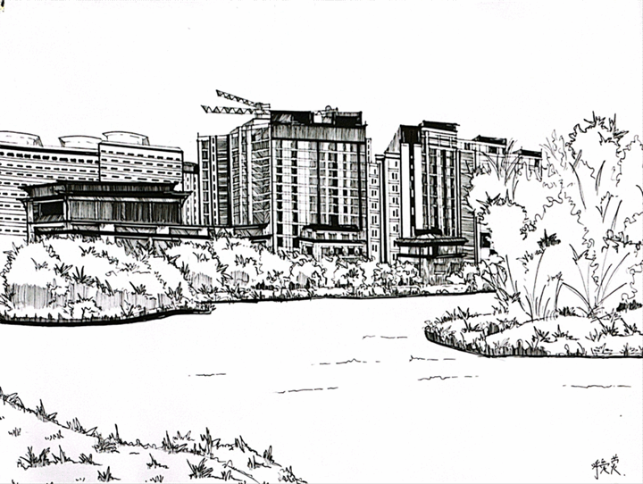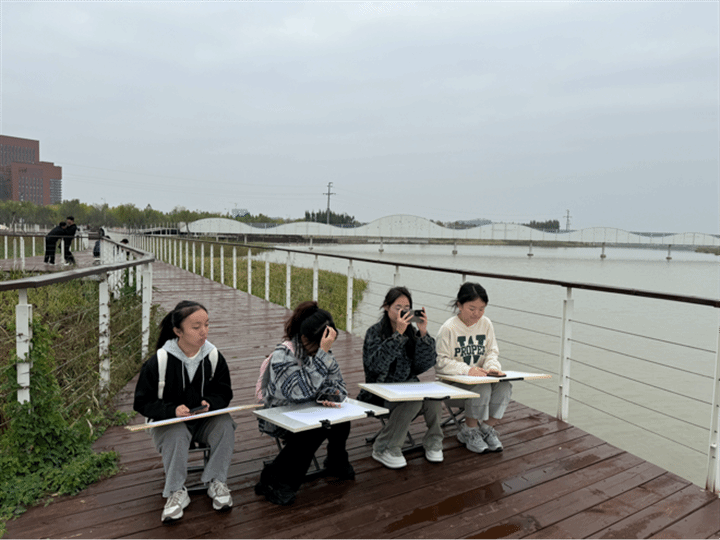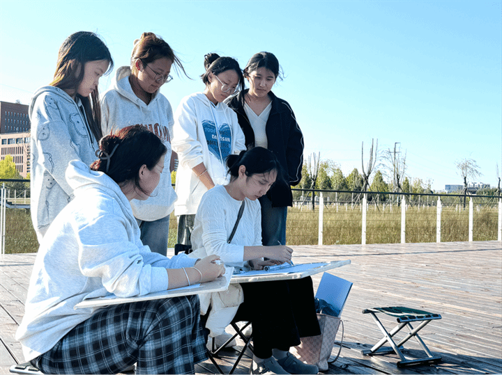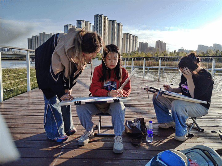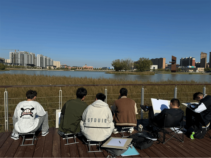 清晨的尧梦湖公园空气清新,景色宜人,学生们满怀期待与热情,携带画具在公园寻找最佳写生点。在湖边芦苇随风摇曳的美景中,学生们迅速支起画板,开始用画笔描绘眼前的景色。他们运用多样的手绘表现技法,从构图布局开始,精心规划,反复调整,力求达到最和谐的视觉效果,绘制出学校图书馆、东湖湾售楼部、公园内的瞭望台、王府小学、周边居民楼等多个建筑,展现了创新思维和工匠精神。教师张宇彤、相玥悦现场指导,范画演示,确保学生技能的提升。