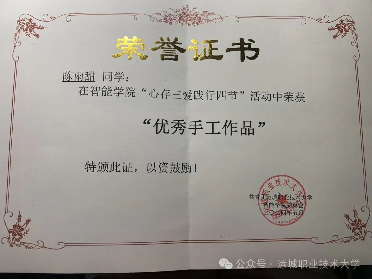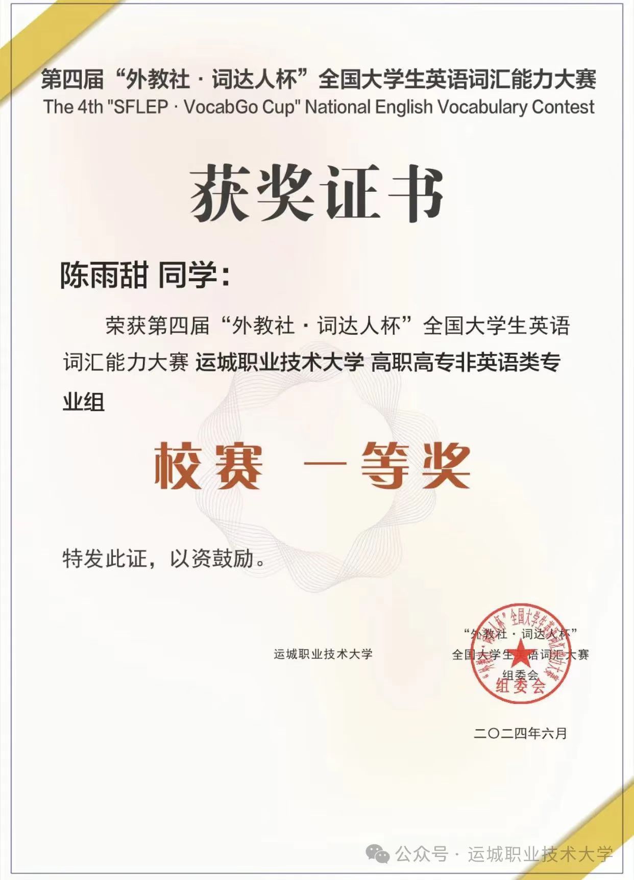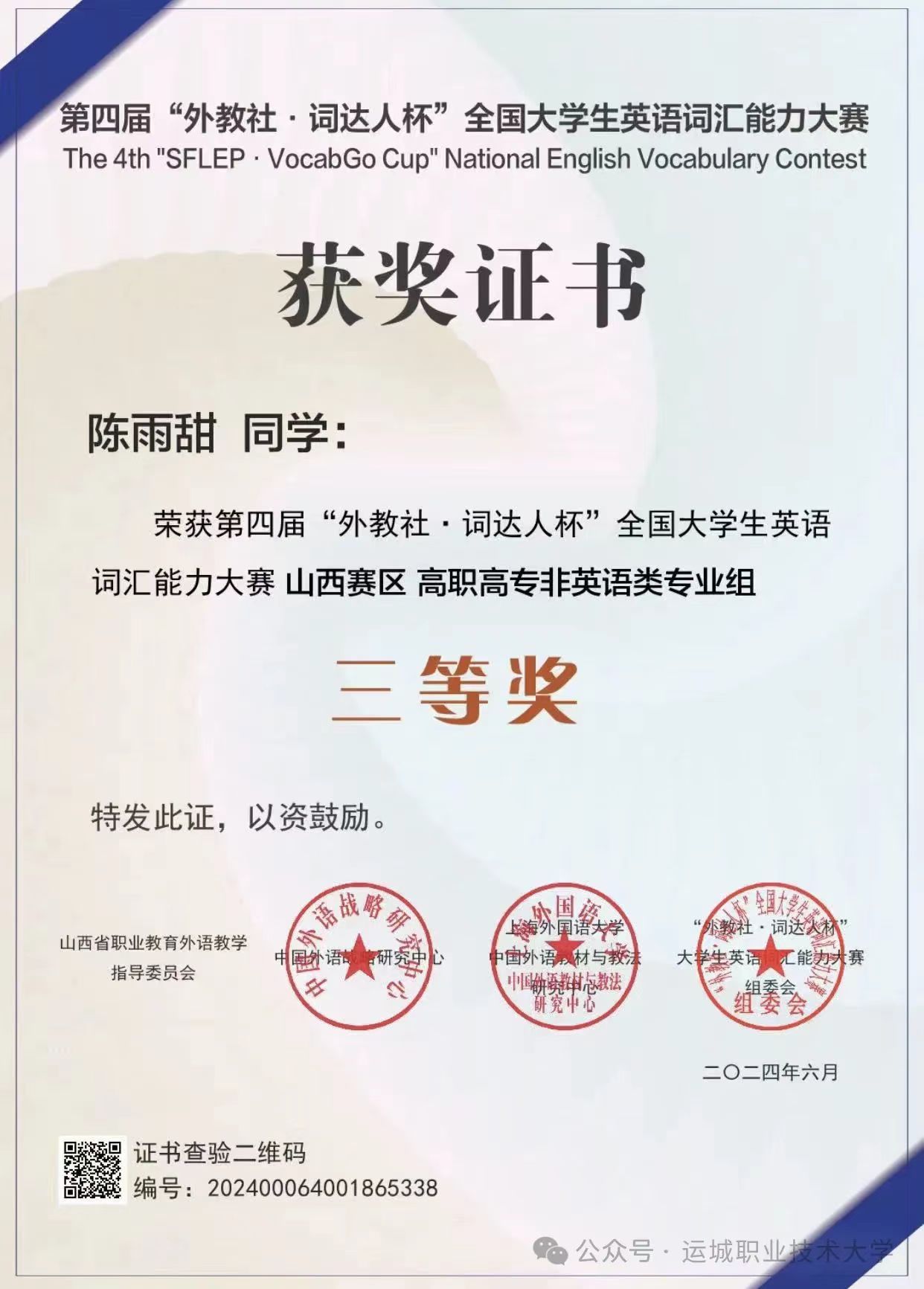 陈雨甜始终保持着高度的热情和专注,自大一开始,她就明确了自己的学习目标,制定了科学合理的学习计划,并严格按照计划执行。她深知“书中自有黄金屋”,只有不断地学习和探索,才能提高自己的综合素质和能力水平。功夫不负有心人,通过不懈的努力,她的学业成绩一直名列前茅。在过去的一年中,她在本专业中排名第一,各专业课程的平均成绩也保持在90分以上。此外,她积极参加学术比赛,2024年6月荣获第四届“外教社·词达人”全国大学生英语词汇能力大赛bat365平台官网高职高专非英语类专业组校赛一等奖以及山西赛区非英语类专业组三等奖。