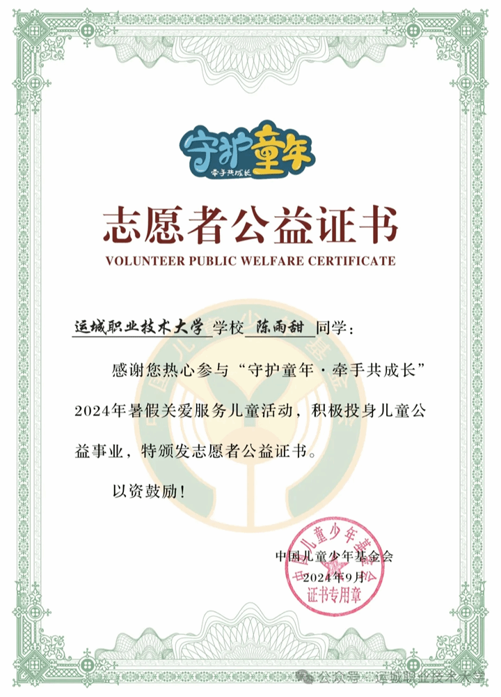 在大学课余时间,陈雨甜积极参加学校组织的党课培训、主题党日活动等,不断提高自己的政治觉悟和思想认识,坚定共产主义信念,树立正确的世界观、人生观和价值观。她还利用课余时间投身志愿事业,参加了“村晚嘉年华活动的站岗志愿者”、“晨丹诗歌诵读志愿者”、“八一健康公益跑”、社区志愿者、守护清澈河源等活动,以及长子县大学生实习实训活动。除此之外,她还参加了由中国儿童少年基金会举办的“守护童年——牵手共同成长”社会实践项目。在假期,她经常探望位于长治市内一所中学的留守儿童。当看到收到新衣服、新书包的孩子们洋溢着的笑容时,她觉得一切付出都值得,真正让有需要的儿童感受到了温暖。她也获得了由中国儿童少年基金会颁发的“志愿者公益证书”及“暑期社会实践优秀个人”称号。