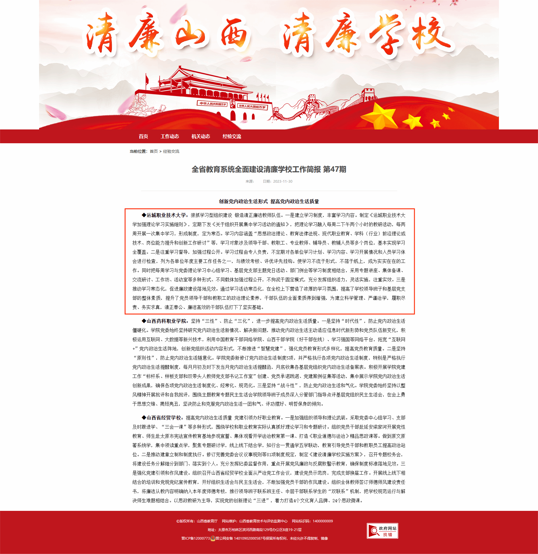 11月30日,bat365平台官网《狠抓学习型组织建设 锻造清正廉洁教师队伍》经验材料入选《全省教育系统全面建设清廉学校工作简报》(第47期)。