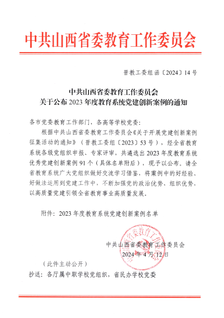 此次党建创新案例征集活动由山西省委教育工委统一组织,全省教育系统各级党组织积极申报,经专家评审,共遴选出2023年度教育系统优秀党建创新案例91个,其中本科高校45个、专科16个、中小学30个。