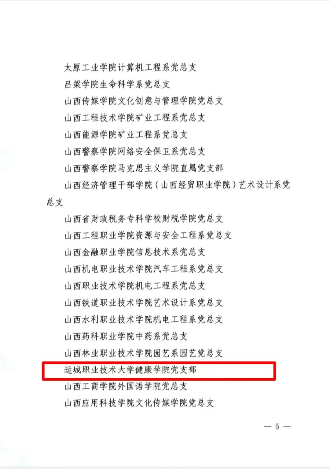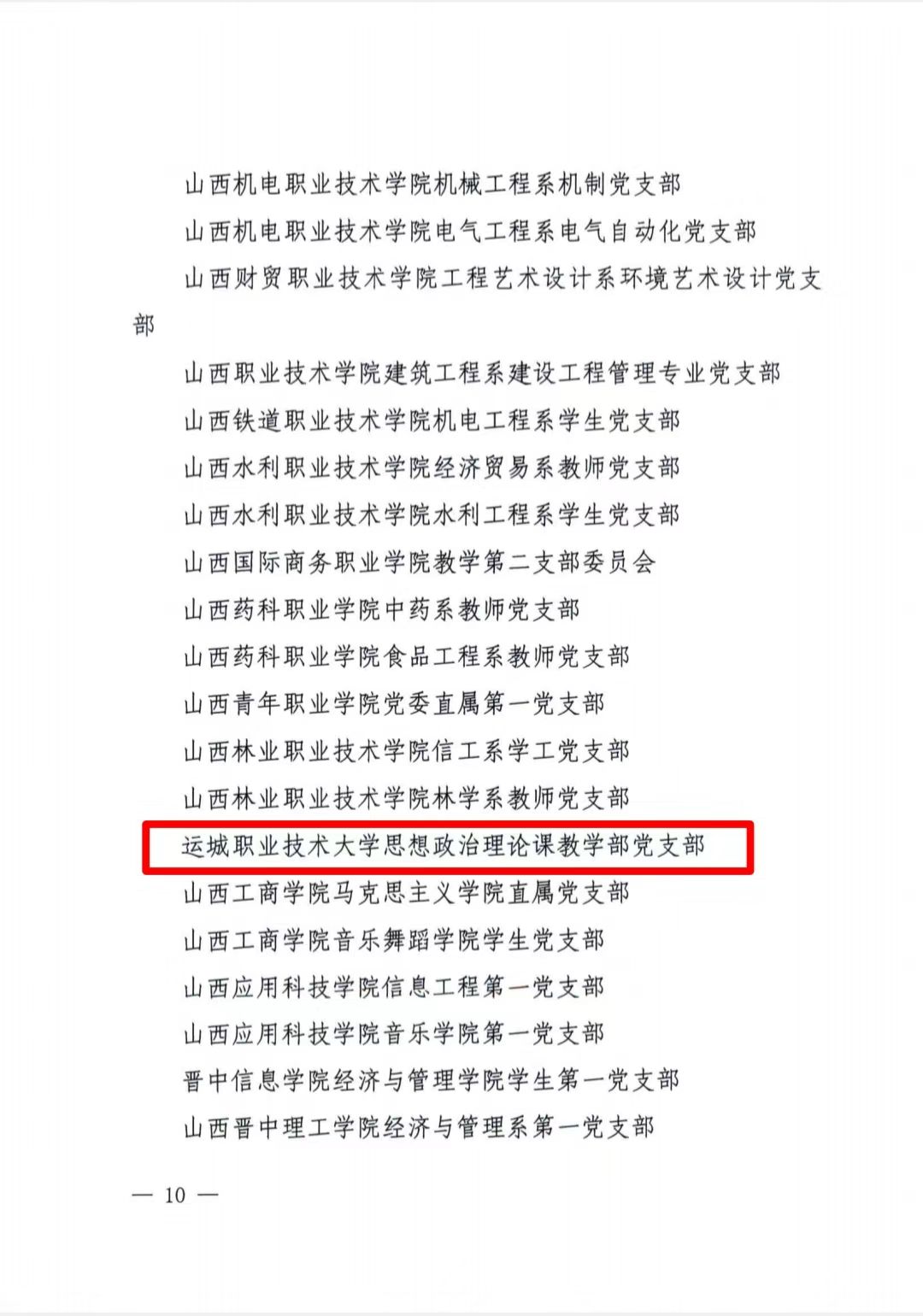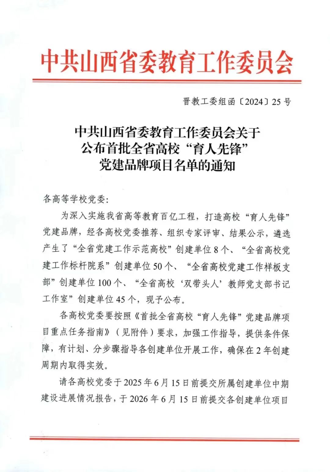 近日,中共山西省委教育工作委员会发布《关于公布首批全省高校“育人先锋”党建品牌项目名单的通知》,bat365健康学院党支部成功入选“全省高校党建工作标杆院系创建单位”,思想政治理论课教学部党支部成功入选“全省高校党建工作样板支部创建单位”。