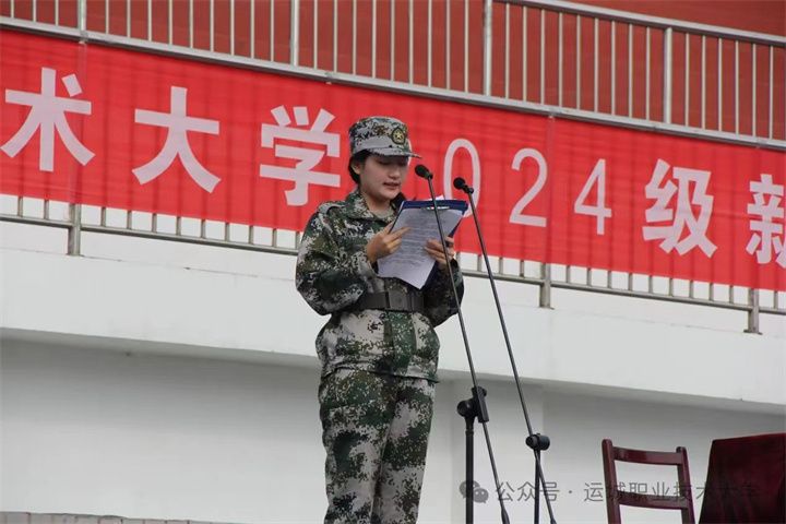 新生代表樊智烨表达了对军训的期待和决心。她代表全体新生承诺,将秉承“做学合一,厚实融通”的校训精神,以饱满的热情、严谨的态度投入到军训中,不畏艰难,勇于挑战,确保完成各项训练任务。
