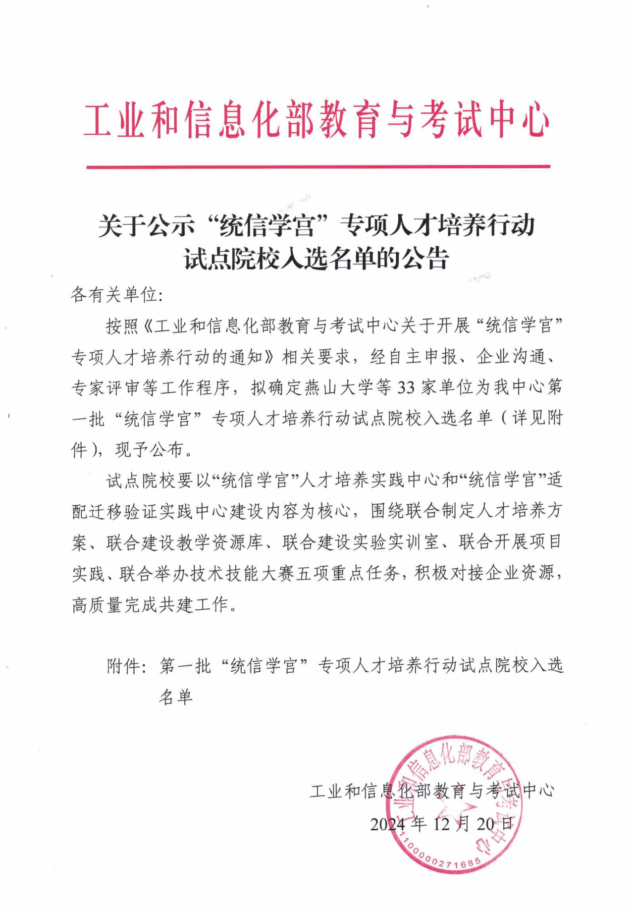 近日,工业和信息化部教育与考试中心发布第一批“统信学宫”专项人才培养行动试点院校入选名单,bat365成功入选“统信学宫”人才培养实践中心共建项目。