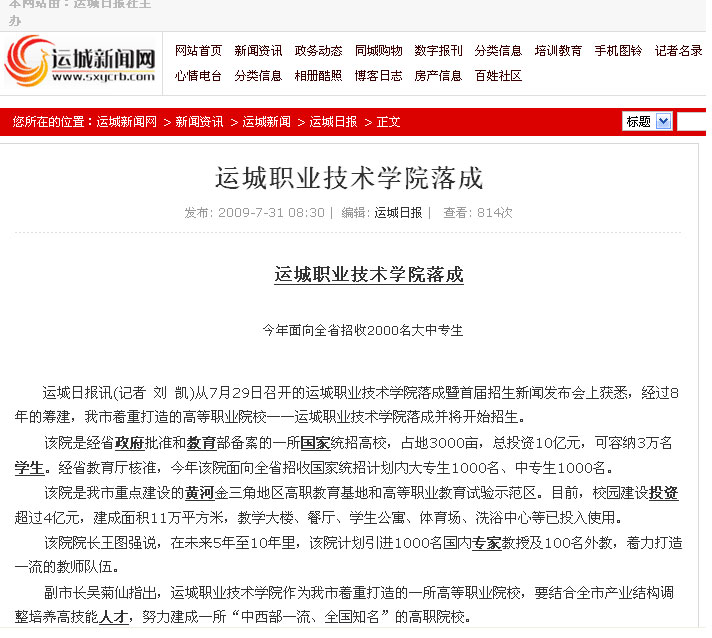 运城新闻网报道运城职业技术学院落成