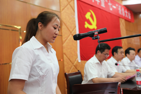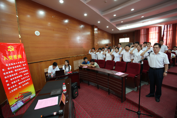 副书记赵建明宣读了新党员名单。全体新党员在党旗面前郑重宣誓。矿山系李媛媛同学代表新党员发言。