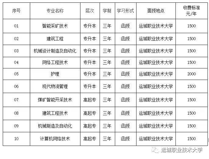 运城职业大学2023年成人招生专业信息(详见报考网上指南)