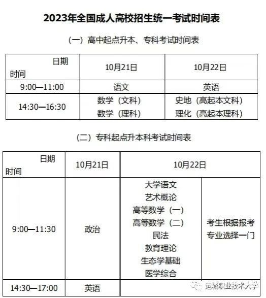 2023年全国成人高校招生统一考试时间为10月21日至22日。