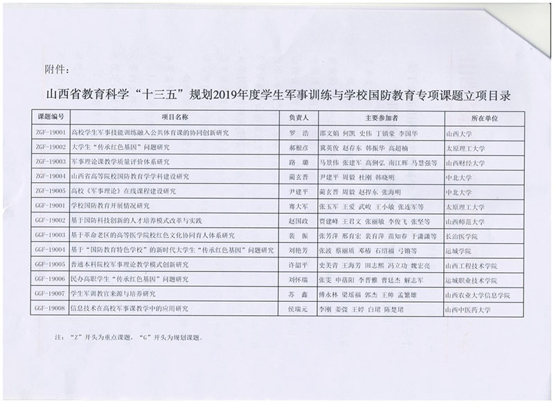 根据《关于公布山西省教育科学“十三五”规划2019年度学生军事训练与学校国防教育专项课题立项的通知》,我院学生处刘怀瑞老师主持申报的科研课题获批立项。